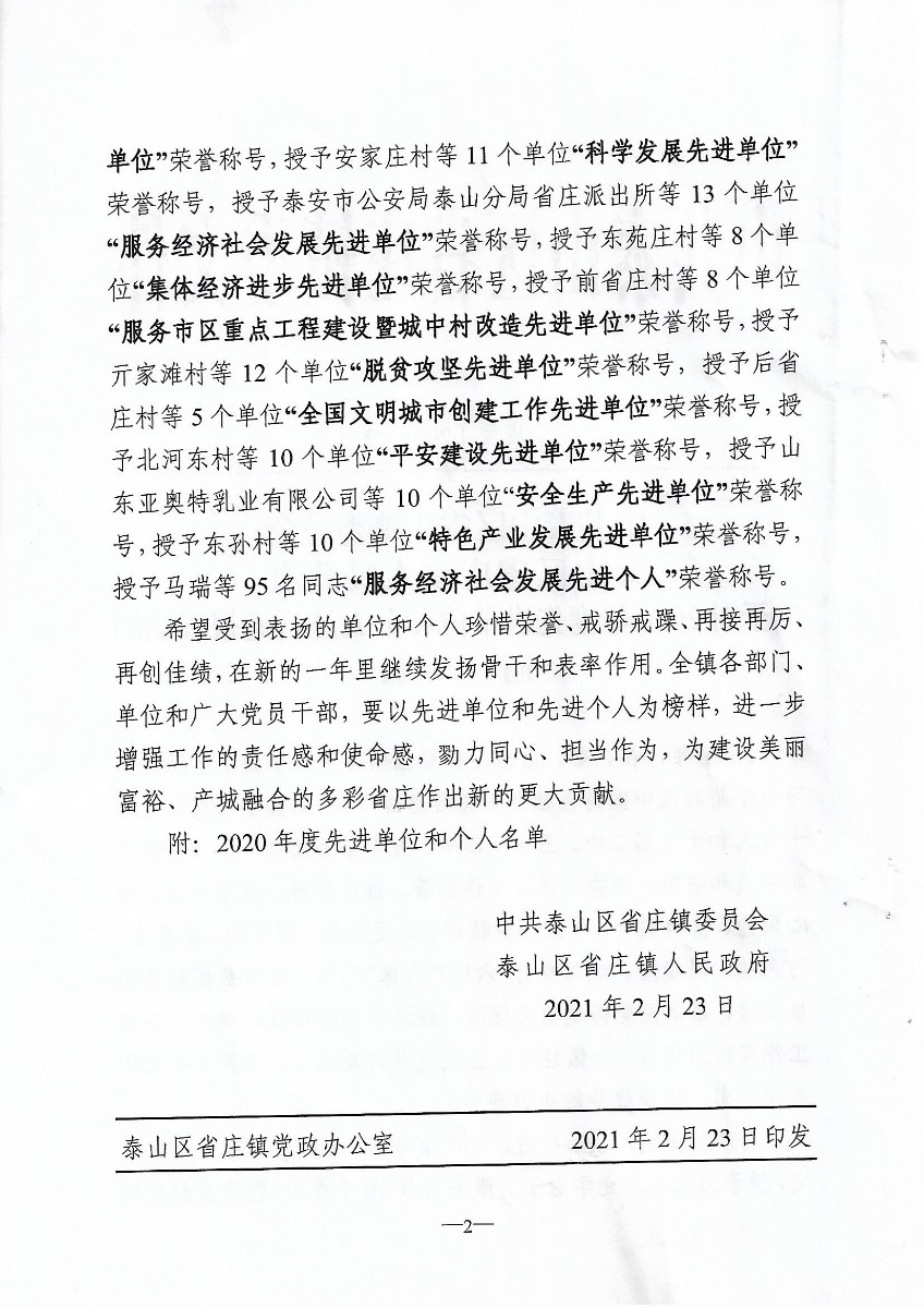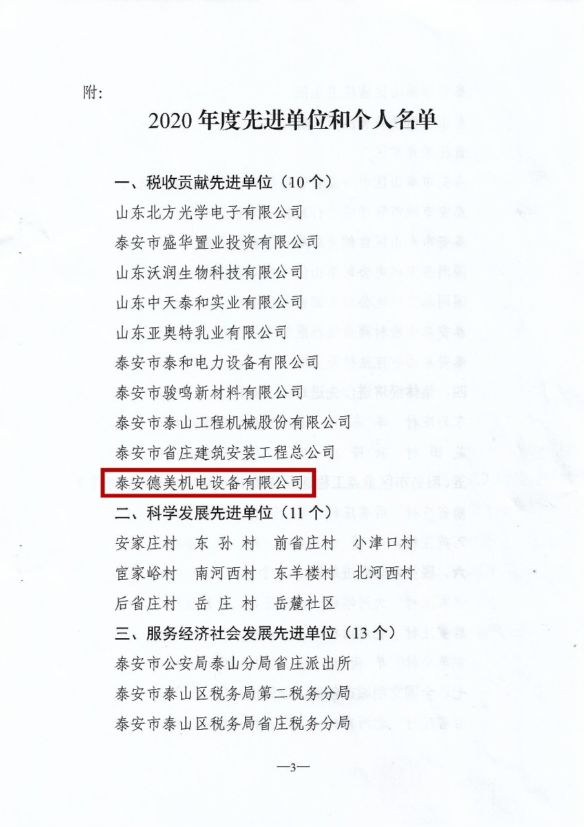 近日,中共泰山區(qū)省莊鎮(zhèn)委員會(huì)、泰山區(qū)省莊鎮(zhèn)人民政府為突出貢獻(xiàn)的2020年度先進(jìn)單位予以表彰。共10家企業(yè)獲評(píng)“稅收貢獻(xiàn)先進(jìn)單位”,泰安德美機(jī)電榜上有名。