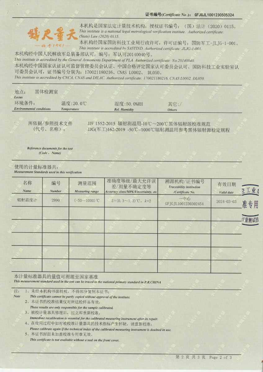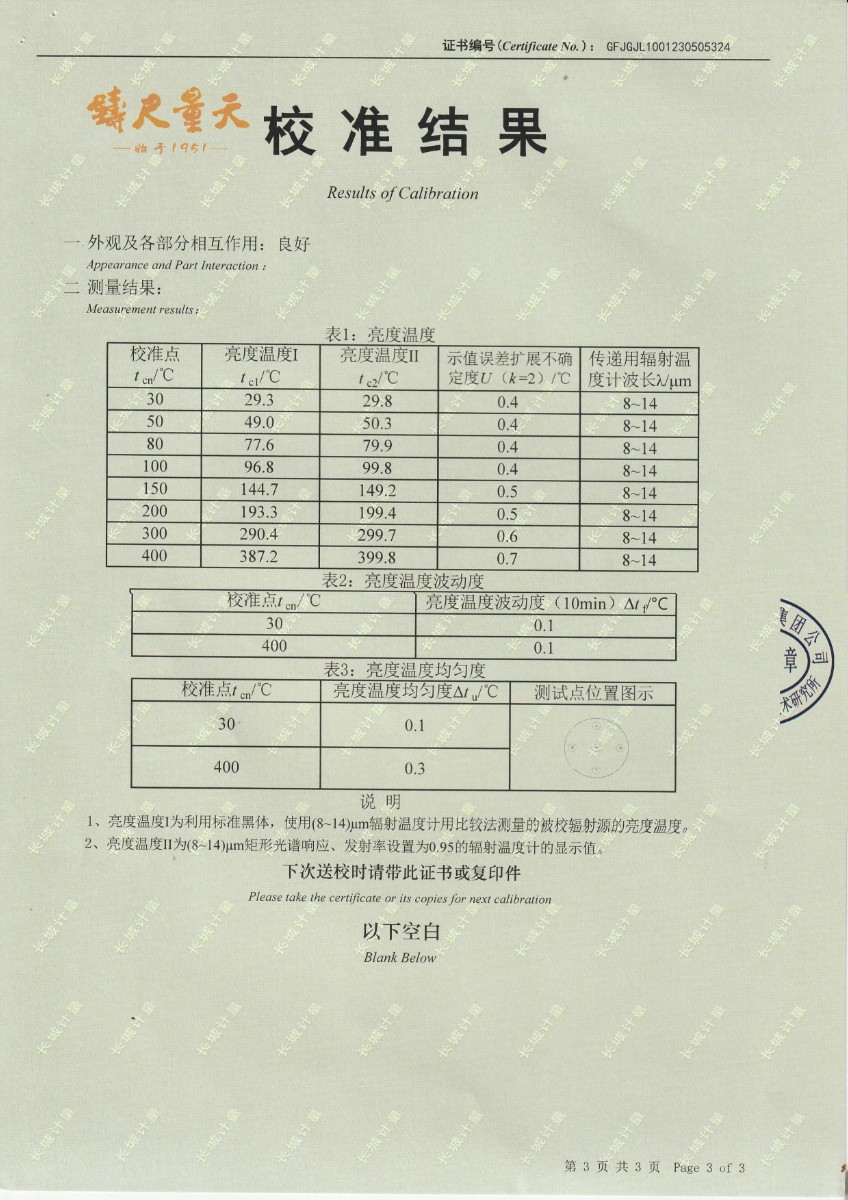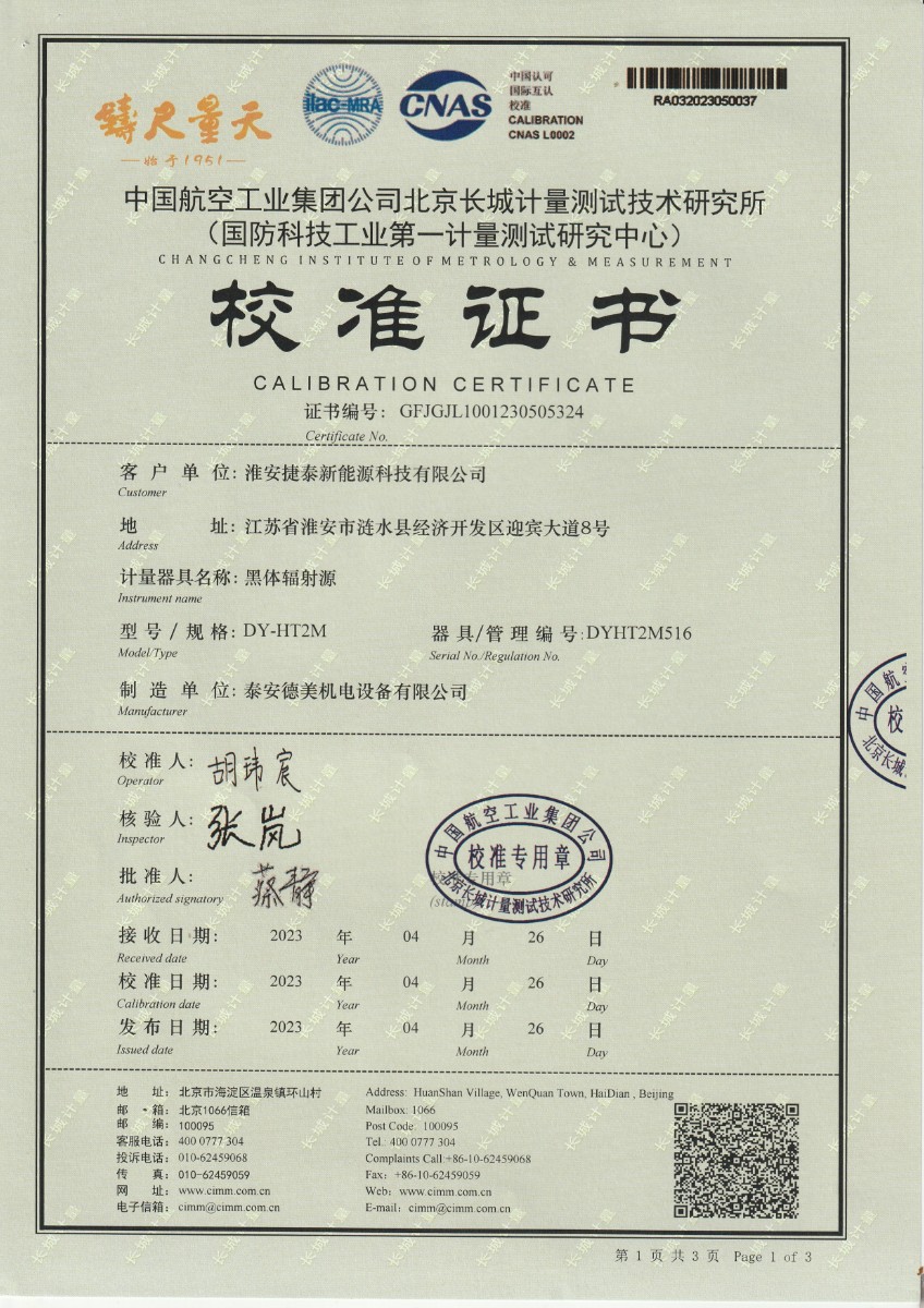 淮安捷泰新能源科技有限公司 黑體輻射源 校準證書 2023-5-18 本文被閱讀 10057 次